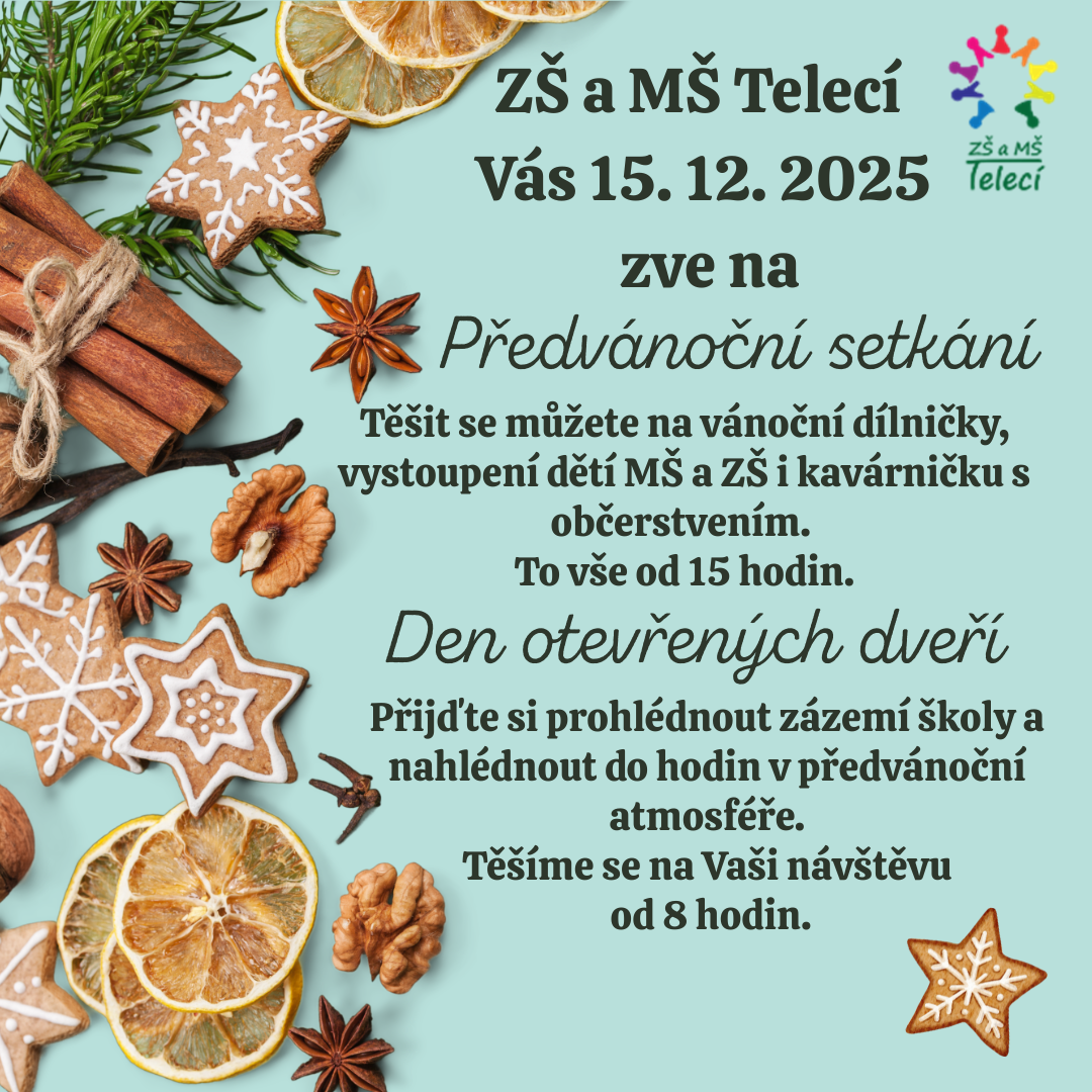 ZŠ a MŠ Telecí Vás 15.12.2025 zve na Předvánoční setkání. Těšit se můžete na vánoční dílničky, vystoupení dětí MŠ a ZŠ i kavárničku s občerstvením. To vše od 15 hodin. Od 8 hodin proběhne Den otevřených dveří - přijďte si prohlédnout zázemí školy a nahlédnout do hodin v předvánoční atmosféře.