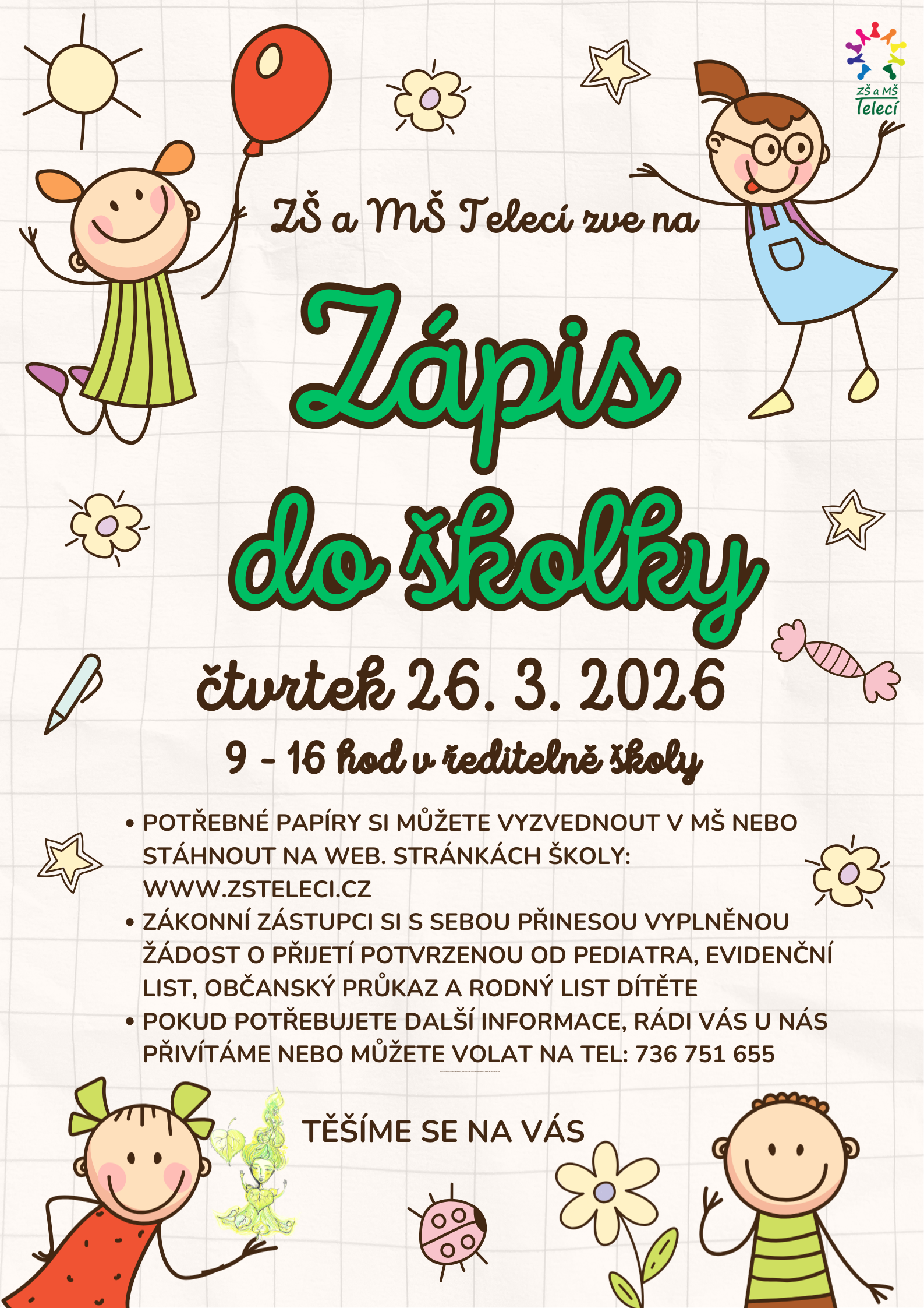 ZŠ a MŠ Telecí zve ve čtvrtek 26. 3. 2026 od 9 - 16 hod. na ZÁPIS DO ŠKOLKY. Zápis proběhne v ředitelně školy. Potřebné papíry si můžete vyzvednout v MŠ nebo stáhnout na webových stránkách školy. Zákonní zástupci si s sebou přinesou vyplněnou žádost o přijetí potvrzenou od pediatra, evidenční list, občanský průkaz a rodný list dítěte. Další informace na tel: 736 751 655.