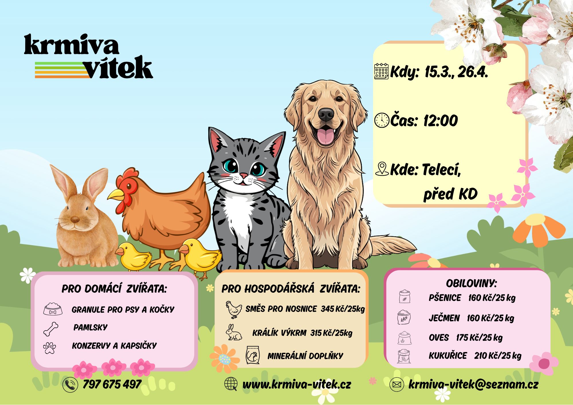 Firma Vítek bude v neděli 15.3.2026 ve 12:00 před KD prodávat krmiva pro domácí a hospodářská zvířata. Nyní v akci: letní směs pro nosnice 345 Kč/25 kg, králík výkrm 315 Kč/25 kg, kapsička pro kočky od 5 Kč/ks. Dále proběhne výkup králičích kůží za 15 Kč/ks.
