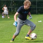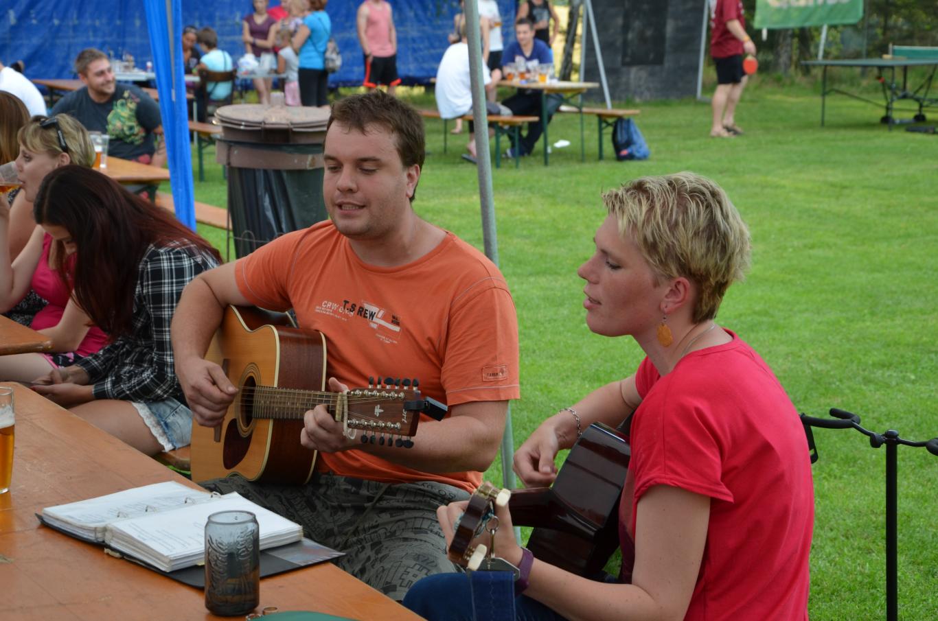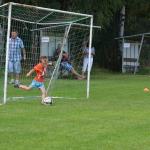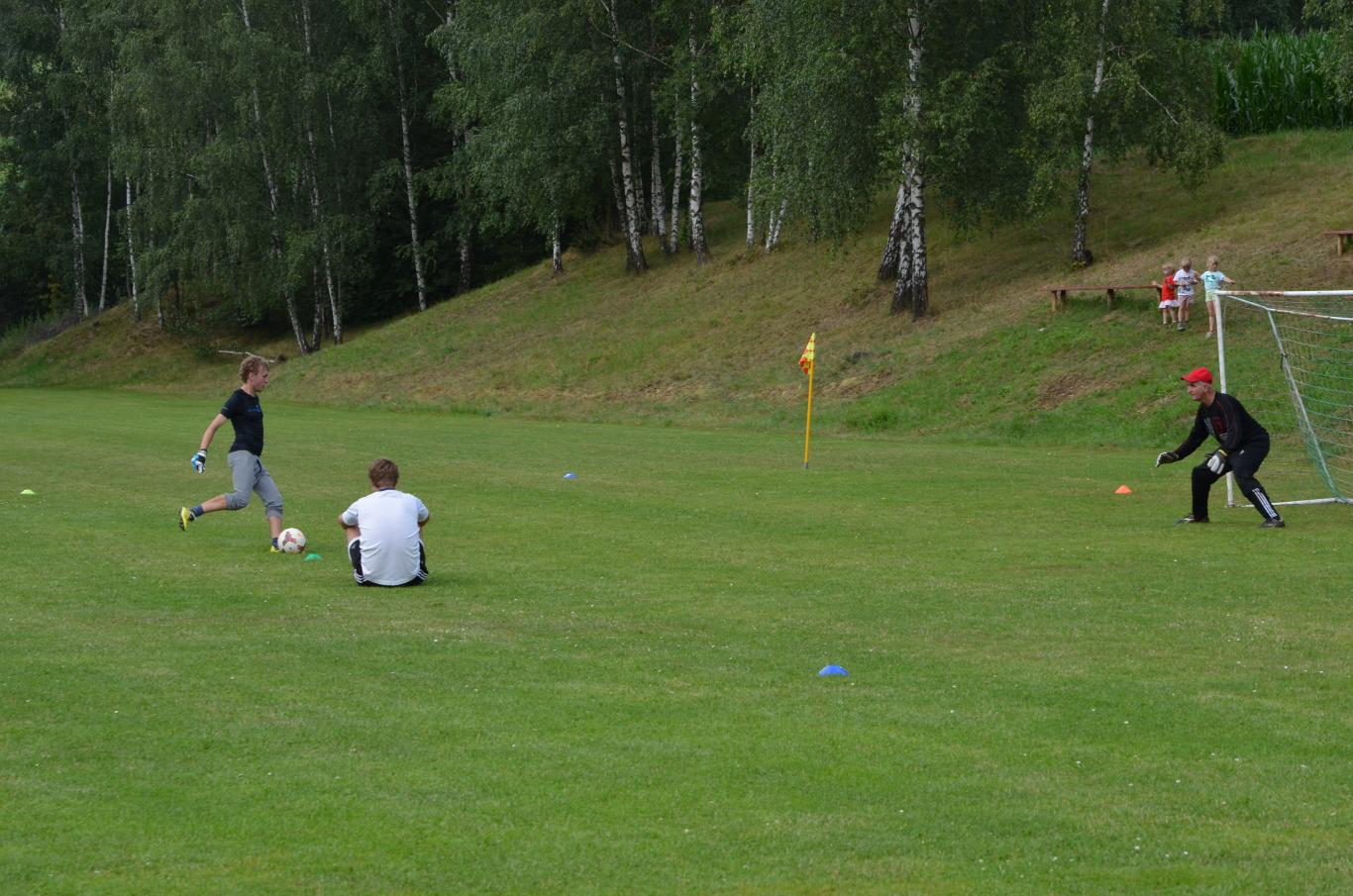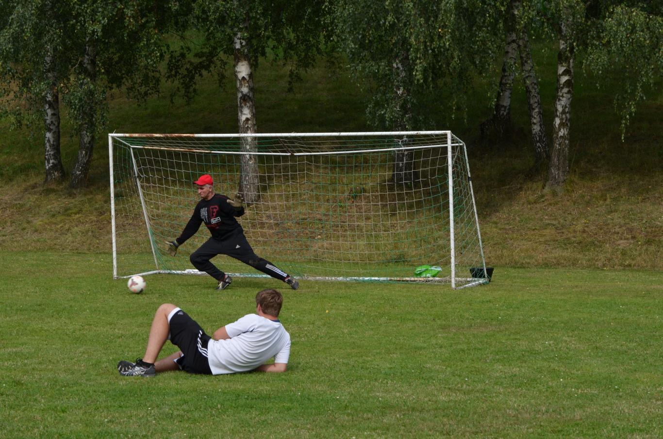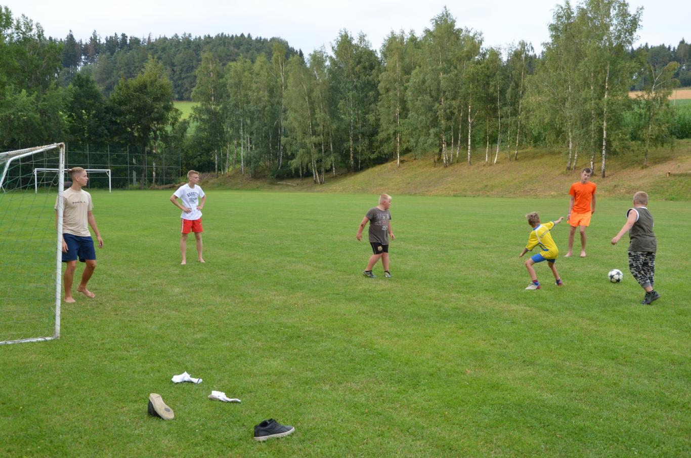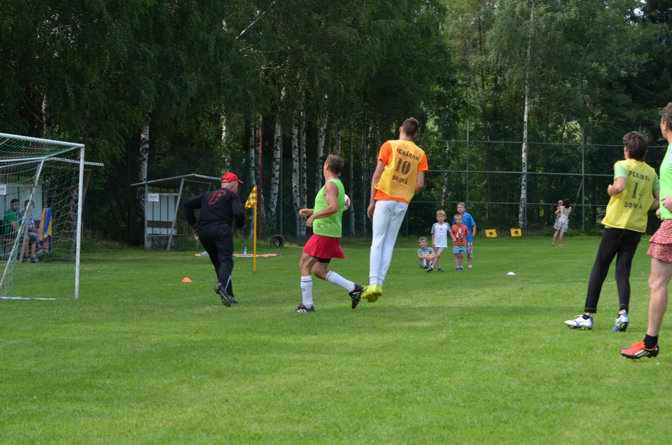 Pouťové posezení na fotbalovém hřišti, kde se hrál fotbal svobodných proti ženatým a maminek proti dětem.